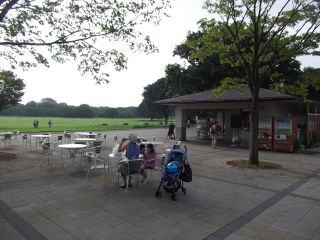 みんなの原っぱわきの売店のテーブルに腰を下ろして休憩をとろう